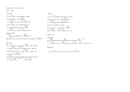 Intro C Verse 1 C Em If you ever find yourself stuck in the middle of the sea Am G F I'll sail the world to find you C Em If you ever find yourself lost in the dark and you can't see Am GDownload Bruno Mars Count On Me sheet music notes and printable PDF score is arranged for Ukulele Learn Count On Me sheet music in minutes JavaScript seems to be disabled in yourCount On Me (Bruno Mars) Guitar Chord Chart Count On Me (Bruno Mars) Guitar Chord Chart Today Watch Explore Love song Hallelujah